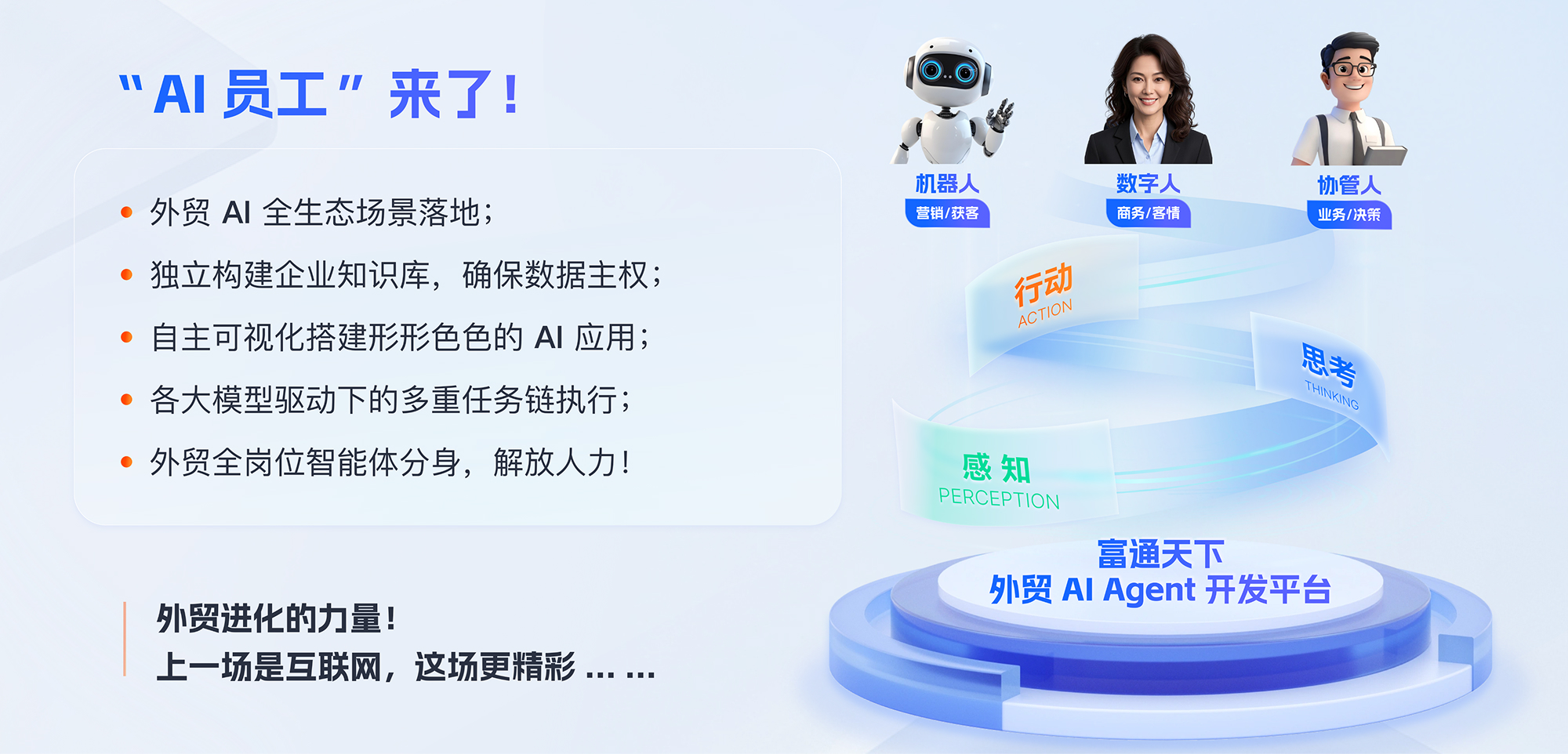 今天,随着云技术的快速发展,中国外贸已经迈入以ABC(人工智能、大数据、云计算)为特征的云时代。富通天下的使命是:用富通天下、做天下生意,我们就是要帮助中国480万外贸企业迈入云时代,普惠实现外贸企业数字化营销和管理!
