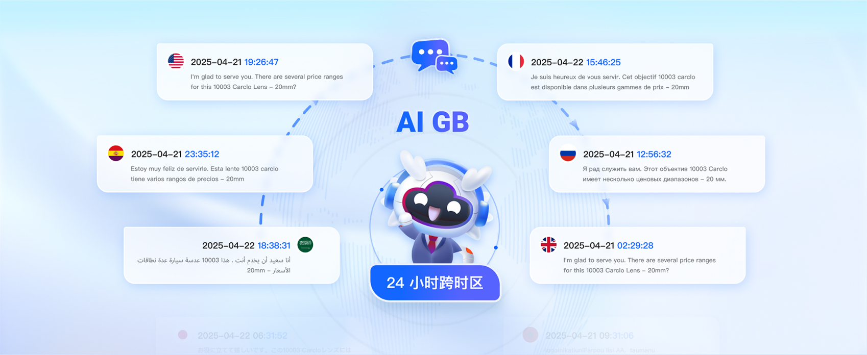 AI GB具备多语言自主服务能力,能自动识别客户IP和提问语种。可24小时全天候、跨时区接待独立站全球买家。AI GB根据企业自己的AI知识库,能不断的训练、学习和进化,替代业务员与客户进行对话,主动持续触达营销,提升独立站接待效率,锁定访客商机。