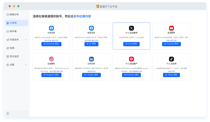 富通天下云平台集成了八大国外主流社媒平台,实现多平台多账号矩阵式管理。AI内容创作30秒即可生成符合平台调性、满足用户需求、贴合外贸场景的优质内容。只需一次创作,可多账号复用,多社媒平台一键发布。更能一站式进行消息处理、快捷回复,让社媒运营零门槛。无缝衔接独立站和CRM系统,构建营销引流到商机转化的全链路闭环。