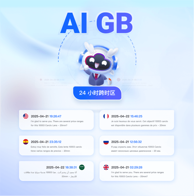 AI GB具备多语言自主服务能力,能自动识别客户IP和提问语种。可24小时全天候、跨时区接待独立站全球买家。AI GB根据企业自己的AI知识库,能不断的训练、学习和进化,替代业务员与客户进行对话,主动持续触达营销,提升独立站接待效率,锁定访客商机。