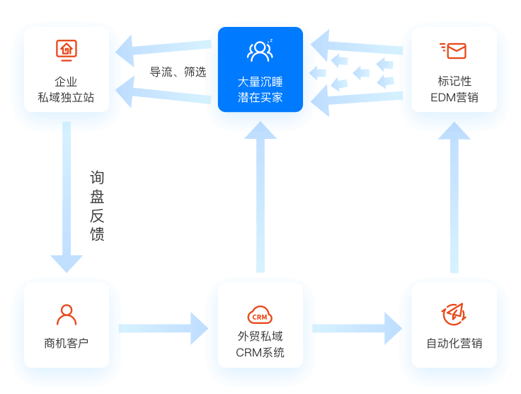 富通天下云平台拥有独创的“靶向筛选”技术,将您的企业私域独立站和独创的标记性EDM进行无缝的集成关联,再结合富通天下24年锤炼的智能外贸私域CRM,形成高效的“靶向筛选”机制,将大量宝贵的沉睡潜在买家主动导流到您的企业私域独立站,激活沉睡客户、追踪买家行为;高效地构建企业私域流量池。